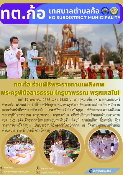 วันที่ 19 มกราคม 2566 เวลา 13.00 น. นายอุดม เชียงยศ นายกเทศมนตรีตำบลก้อ พร้อมด้วย ว่าที่ร้อยตรีชัยยุทธ คุณาพรสุจริต ปลัดเทศบาลตำบลก้อ พนักงานและเจ้าหน้าที่เทศบาลตำบลก้อ ร่วมพิธีทอดผ้าไตรบังสุกุล พิธีพระราชทานเพลิงศพ พระครูพินิจสารธรรม (ครูบาพรรณ พรฺหมเสโน) อดีตที่ปรึกษาเจ้าคณะตำบลนาทรายเขต 1-2 อดีตเจ้าอาวาสวัดพระพุทธบาทห้วยต้ม โดยมี นายสันติธร ยิ้มละมัย ผู้ว่าราชการจังหวัดลำพูน เป็นประธานพิธีทอดผ้าไตรบังสุกุล ณ วัดพระพุทธบาทห้วยต้ม ตำบลนาทราย อำเภอลี้ จังหวัดลำพูน