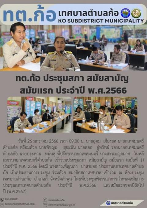 วันที่ 26 มกราคม 2566 เวลา 09.00 น. นายอุดม เชียงยศ นายกเทศมนตรีตำบลก้อ พร้อมด้วยนายพิชญะ สุยะมัน นายลออ อู่ทรัพย์ รองนายกเทศมนตรีตำบลก้อ นายประทาน หม่นสุ ที่ปรึกษานายกเทศมนตรี นางสาวเบญจมาศ วันหลี เลขานายกเทศมนตรีตำบลก้อเข้าร่วมประชุมสภา สมัยสามัญ สมัยแรก (สมัยที่ 1) ประจำปี พ.ศ. 2566 โดยมี นางสาวเพ็ญนภา ปาสายออ ประธานสภาเทศบาลตำบลก้อ เป็นประธานการประชุม ร่วมด้วย สมาชิกสภาเทศบาล เข้าร่วม ณ ห้องประชุมเทศบาลตำบลก้อ อำเภอลี้ จังหวัดลำพูน โดยที่ประชุมพิจารณาการกำหนดสมัยการประชุมสภาเทศบาลตำบลก้อ ประจำปี พ.ศ.2566 และสมัยแรกของปีถัดไป (ปี พ.ศ.2567)