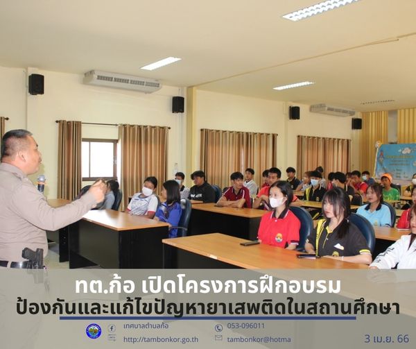วันที่ 3 เมษายน 2566 เวลา 09.00 น. นายอุดม เชียงยศ นายกเทศมนตรีตำบลก้อ เป็นประธาน เปิดโครงการฝึกอบรมป้องกันและแก้ไขปัญหายาเสพติดในสถานศึกษา พร้อมด้วย นายประทาน หม่นสุ ที่ปรึกษานายกเทศมนตรี ว่าที่ร้อยตรีชัยยุทธ คุณาพรสุจริต ปลัดเทศบาลตำบลก้อ พนักงานเทศบาลตำบลก้อ และนักเรียนในพื้นที่ตำบลก้อ เข้าร่วม ณ ห้องเทศบาลตำบลก้อ อำเภอลี้ จังหวัดลำพูน โดยมี ร.ต.ท.เมธานนท์ ชัยยา รอง สวป.สภ.ก้อ เป็นวิทยากร โครงการฝึกอบรมป้องกันและแก้ไขปัญหายาเสพติดในสถานศึกษาจัดขึ้นเพื่อมุ่งเน้นให้เยาวชนห่างไกลยาเสพติดโดยเฉพาะในสถานศึกษา เพื่อเป็นกำลังสำคัญในการพัฒนาประเทศชาติต่อไป