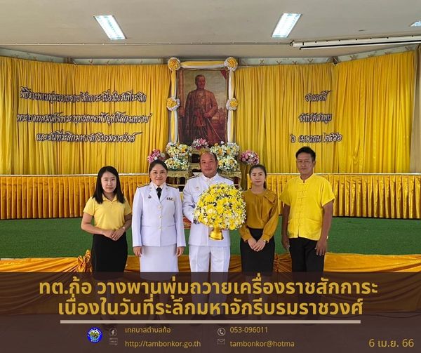 วันที่ 6 เมษายน? 2566 นายอุดม เชียงยศ นายกเทศมนตรีตำบลก้อ มอบหมายให้? พนักงานเทศบาลตำ?บ?ลก้อ? ร่วมประกอบพิธีวางพานพุ่มถวายเครื่องราชสักการะ เนื่องในวันที่ระลึก พระบาทสมเด็จพระพุทธยอดฟ้าจุฬาโลกมหาราช และวันที่ระลึกมหาจักรีบรมราชวงศ์ เพื่อแสดงออกถึงความจงรักภักดีและสำนึกในพระมหากรุณาธิคุณต่อสถาบันพระมหากษัตริย์ โดยมี นายวิวัฒน์ จันทร์โอภาส นายอำเภอลี้ เป็นประธานในพิธี ณ หอประชุมเมืองนักบุญ ที่ว่าการอำเภอลี้ จังหวัดลำพูน