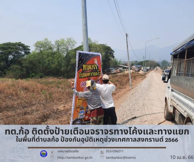 วันที่ 10 เมษายน 2566 นายอุดม เชียงยศ นายกเทศมนตรีตำบลก้อ มอบหมายให้ พนักงานเทศบาลตำบลก้อ งานป้องกันและบรรเทาสาธารณภัย ร่วมกับ อาสาสมัครป้องกันภัยฝ่ายพลเรือน หรือ อปพร. เทศบาลตำบลก้อ ลงพื้นที่ติดตั้งป้ายเตือนจราจรตรงทางโค้งและทางแยกและติดธงแดงในจุดเสี่ยงเกิดอุบัติเหตุ ในพื้นที่ตำบลก้อ อำเภอลี้ จังหวัดลำพูน ตามโครงการป้องกันและลดอุบัติเหตุบนท้องถนน ช่วงเทศกาลสงกรานต์ ปี 2566