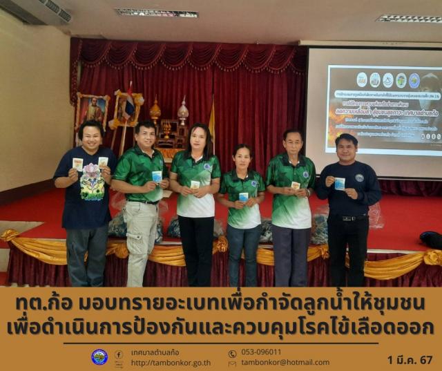 วันที่ 1 มีนาคม 2567 เวลา 09.00 น. นายอุดม เชียงยศ นายกเทศมนตรีตำบลก้อ พร้อมด้วย งานสาธารณสุข สำนักปลัดเทศบาลำบลก้อ ร่วม ผู้นำชุมชนในพื้นที่ รพ.สต.ก้อ เจ้าหน้าที่ อสม.ตำบลก้อ ดำเนินการป้องกันและควบคุมโรคไข้เลือดออก โดยมีกิจกรรมมอบทรายอะเบทเพื่อกำจัดลูกน้ำ พร้อมทั้งสำรวจและเฝ้าระวัง ทำลายแหล่งเพาะพันธุ์ลูกน้ำยุงลาย กำจัดยุงตัวเต็มวัย ในผู้ป่วยรายใหม่และกลุ่มเสี่ยง รวมทั้งประชาสัมพันธ์สร้างความตระหนักรู้ให้ประชาชนในการดูแลป้องกันตนเองให้ปลอดภัยจากโรคไข้เลือดออก เลี่ยงไม่ให้ยุงกัด ทาโลชั่นกันยุง ใส่เสื้อแขนยาว นอนในมุ้ง ณ เทศบาลตำบลก้อ อำเภอลี้ จังหวัดลำพูน