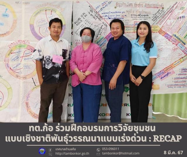 วันที่ 4-8 มีนาคม 2567 นายอุดม เชียงยศ นายกเทศมนตรีตำบลก้อ มอบหมายให้ ข้าราชการ พนักงานเจ้าหน้าที่เทศบาลตำบลก้อเข้าร่วมการประชุมเชิงปฏิบัติการ "ฝึกอบรมการวิจัยชุมชน ด้วยวิธีวิจัยเชิงชาติพันธุ์วรรณนาแบบเร่งด่วน" (Rapid Ethnographic Community Assessment Process: RECAP)