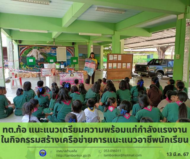 วันที่ 13 มีนาคม 2567 นายอุดม เชียงยศ นายกเทศมนตรีตำบลก้อ มอบหมายให้ นายพิชญะ สุยะมัน รองนายกเทศมนตรีตำบลก้อ หน่วยบริการชุมชนพัฒนาคุณภาพชีวิตแรงงานนอกระบบเทศบาลตำบลก้อ ลงพื้นที่แนะแนว การเตรียมความพร้อมแก่กำลังแรงงานในกิจกรรมสร้างเครือข่ายการแนะแนวอาชีพนักเรียน โครงการ 3 ม (มีงาน มีเงิน มีวุฒิการศึกษาเพิ่ม) และหาตลาดแรงงานให้กับนักเรียนกลุ่มเป้าหมายตามความสามารถและตามความต้องการในพื้นที่ ณ โรงเรียนบ้านก้อจัดสรร ตำบลก้อ อำเภอลี้ จังหวัดลำพูน