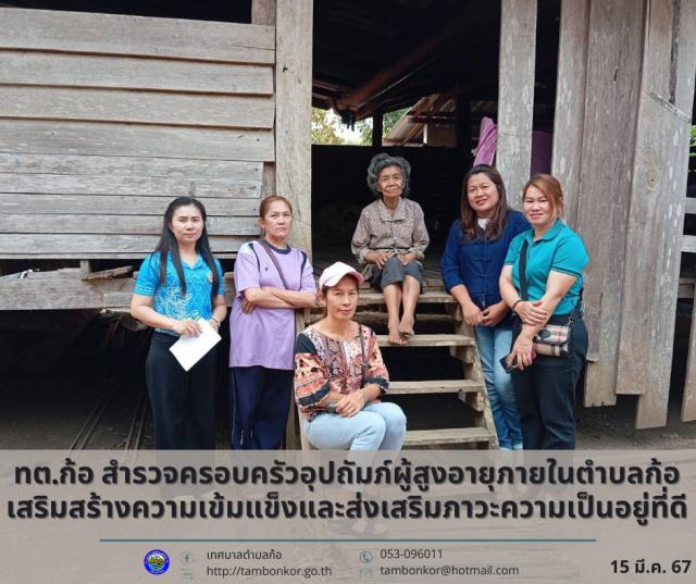 วันที่ 15 มีนาคม 2567 เวลา 09.00 น. นายอุดม เชียงยศ นายกเทศมนตรีตำบลก้อ มอบหมายให้ กองสวัสดิการสังคม พร้อมด้วย สมาชิกสภาเทศบาลตำบลก้อ ลงพื้นที่สำรวจครอบครัวอุปถัมภ์ผู้สูงอายุภายในตำบลก้อ เพื่อติดตามเร่งรัดการขอรับความช่วยเหลือ และสอบถามความต้องการรวมถึงให้กำลังใจ ผู้ยากไร้ ผู้พิการ และผู้ป่วยติดเตียงในชุมชน โดยมีวัตถุประสงค์เพื่อเสริมสร้างความเข้มแข็งและส่งเสริมภาวะความเป็นอยู่ที่ดีของประชากรในพื้นที่เพื่อสนับสนุนผู้ที่ต้องการความช่วยเหลืออย่างเต็มที่ เพื่อให้ชุมชนมีความเป็นอยู่ที่ดีและยั่งยืนมากยิ่งขึ้น ในอนาคต