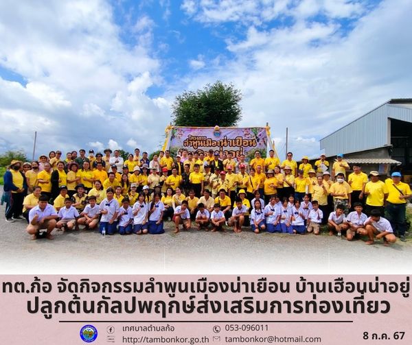วันที่ 8 กรกฎาคม 2567 นายอุดม เชียงยศ นายกเทศมนตรีตำบลก้อ พร้อมด้วย คณะผู้บริหาร สมาชิกสภาเทศบาล พนักงาน และเจ้าหน้าที่เทศบาลตำบลก้อ ร่วมกันจัดกิจกรรม โครงการลำพูนเมืองน่าเยือน บ้านเฮือนน่าอยู่ กิจกรรมปลูกต้นกัลปพฤกษ์สองข้างทางถนนเส้นหน้าเทศบาลตำบลก้อปรับปรุงภูมิทัศน์ส่งเสริมการท่องเที่ยว โดยมี นายอัคค์สัจจา ใจบุญตระกูล ปลัดอาวุโสอำเภอลี้ เป็นประธานกล่าวเปิดโครงการ มีผู้เข้าร่วม ได้แก่ กำนัน ผู้ใหญ่บ้าน ผู้อำนวยการคณะครูและนักเรียนโรงเรียนบ้านก้อจัดสรร ผู้อำนวยการโรงพยาบาลส่งเสริมสุขภาพตำบลก้อ อาสาสมัครสาธารณสุขตำบลก้อ แพทย์ประจำตำบลก้อ สถานีตำรวจภูธรตำบลก้อ อุทยานแห่งชาติแม่ปิง สถานีควบคุมไฟป่าแม่ปิง และประชาชนตำบลก้อ จำนวน 200 คน ณ โกดังพ่อเลี้ยงจบ หมู่ 2 ตำบลก้อ อำเภอลี้ จังหวัดลำพูน