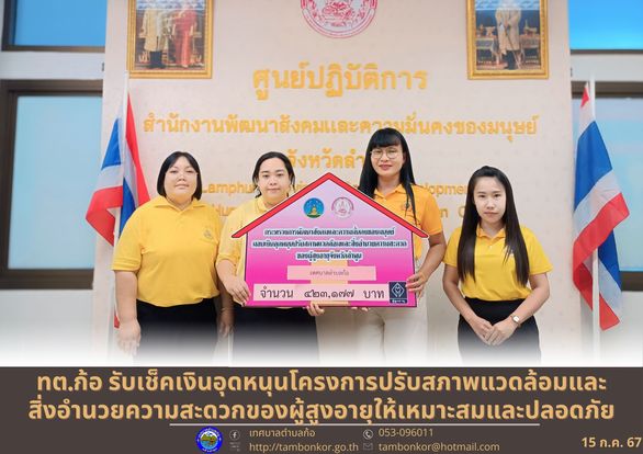 วันที่ 15 กรกฎาคม 2567 นายอุดม เชียงยศ นายกเทศมนตรีตำบลก้อ มอบหมายให้ นายพิชญะ สุยะมัน รองนายกเทศมนตรีตำบลก้อ รับเช็คเงินอุดหนุนโครงการปรับสภาพแวดล้อมและสิ่งอำนวยความสะดวกของผู้สูงอายุให้เหมาะสมและปลอดภัย ประจำปีงบประมาณ 2567 ตามที่ สำนักงานพัฒนาสังคมและความมั่นคงของมนุษย์จังหวัดลำพูน ได้ประชาสัมพันธ์ให้องค์กรปกครองส่วนท้องถิ่นพิจารณาคัดเลือกผู้สูงอายุในพื้นที่ที่ประสบปัญหาด้านที่อยู่อาศัยไม่มั่นคงปลอดภัยและส่งแบบคำขอรับการปรับสภาพแวดล้อมและสิ่งอำนวยความสะดวกของผู้สูงอายุให้เหมาะสมและปลอดภัยประจำปีงบประมาณ 2567 เพื่อพิจารณาให้ความช่วยเหลือตามความเหมาะสม โดยราษฎรในพื้นที่ตำบลก้อได้รับการช่วยเหลือ จำนวน 11 ราย เป็นเงิน 423,177 บาท (สี่แสนสองหมื่นสามพันหนึ่งร้อยเจ็ดสิบเจ็ดบาทถ้วน) ณ สำนักงานพัฒนาสังคมและความมั่นคงของมนุษย์จังหวัดลำพูน ชั้น 1 ศาลากลางจังหวัดลำพูน