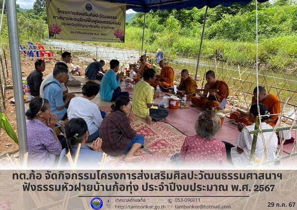 หน้าแรก > อัลบั้มภาพกิจกรรม > จัดกิจกรรมโครงการส่งเสริมศิลปะวัฒนธรรมศาสนาฯ ฟังธรรม?หัวฝายบ้านก้อทุ่ง ประจำปีงบประมาณ พ.ศ. 2567 ( ประกาศเมื่อวันที่ 29 กรกฏาคม 2567 )