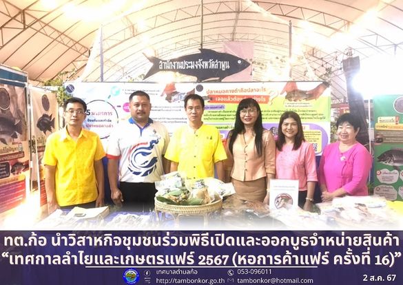 วันที่ 2 สิงหาคม? 2567 นายอุดม เชียงยศ นายกเทศมนตรีตำบลก้อ มอบหมายให้ นายพิช?ญ?ะ? สุ?ยะ?มัน? รองนายก?เทศมนตรี?ตำ?บ?ลก้อ? องค์กรชุมชนประมงท้องถิ่นเทศบาลตำบลก้อ? ร่วมงานพิธีเปิดงาน “เทศกาลลำไยและเกษตรแฟร์ 2567 (หอการค้าแฟร์ ครั้งที่ 16)” และจำหน่ายผลิตภัณฑ์ องค์กรชุมชนประมงท้องถิ่น ณ บริเวณที่เอกชน บ้านแม่สารป่าแดด ถนนลำพูน-ดอยติ ตำบลเวียงยอง อำเภอเมืองลำพูน จังหวัดลำพูน? เพื่อส่งเสริมการตลาดวิสาหกิจชุมชนตำบลก้อ? ส่งเสริมการสร้างรายได้และช่องทางการตลาดที่หลากหลายและกว้างขึ้น? พัฒนาคุณภาพ?ชีวิต? สร้างรายได้เสริมอย่างยั่งยืน