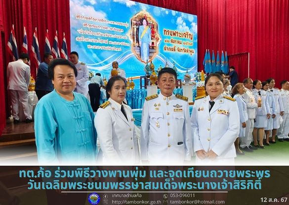 วันที่ 12 สิงหาคม 2567 นายอุดม เชียงยศ นายกเทศมนตรีตำบลก้อ มอบหมายให้ ว่าที่ร้อยตรีชัยยุทธ คุณาพรสุจริต ปลัดเทศบาลตำ?บลก้อ พร้อมด้วย กองยุทธศาสตร์และงบประมาณ เทศบาลตำบลก้อ เข้าร่วมกิจกรรมวางพานพุ่ม และจุดเทียนถวายพระพรชัยมงคลเนื่องในโอกาสวันเฉลิมพระชนมพรรษาสมเด็จพระนางเจ้าสิริกิติ์