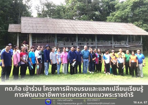 วันที่ 15-16 สิงหาคม 2567 นายอุดม เชียงยศ นายกเทศมนตรีตำบลก้อ มอบหมายให้ นายพิชญะ สุ?ยะ?มัน? รองนายก?เทศมนตรีตำบลก้อ เข้าร่วม โครงการฝึกอบรมและแลกเปลี่ยนเรียนรู้การพัฒนาอาชีพการเกษตรตามแนวพระราชดำริ