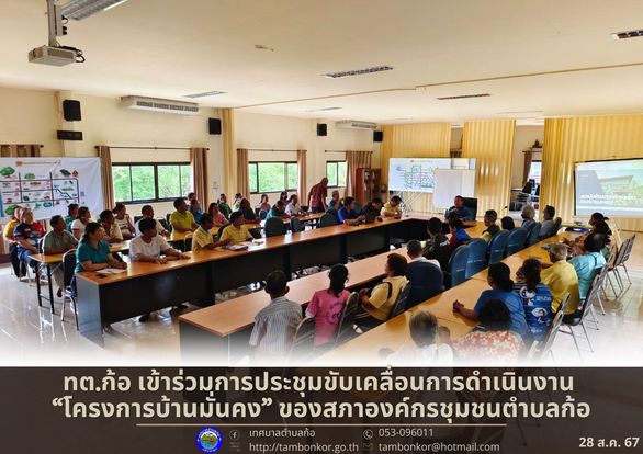 วันที่ 28 สิงหาคม 2567 เวลา 09.00 น. นายอุดม เชียงยศ นายกเทศมนตรีตำบลก้อ เข้าร่วม การประชุมขับเคลื่อนการดำเนินงานช่วยเหลือสนับสนุนการพัฒนาคุณภาพชีวิตของประชาชนในตำบลก้อ “โครงการบ้านมั่นคง” ของสภาองค์กรชุมชนตำบลก้อ ปีงบประมาณ พ.ศ. 2567 โดยมี นายอัคค์สัจจา ใจบุญตระกูล ปลัดอาวุโสอำเภอลี้ เป็นประธานการประชุม ณ ห้องประชุมเทศบาลตำบลก้อ ตามที่ สถาบันพัฒนาองค์กรชุมชน สภาองค์กรชุมชนตำบลก้อ กลุ่ม/เครือข่าย/องค์กร สภาองค์กรชุมชนตำบลก้อ เป็นองค์กรที่ให้การช่วยเหลือสนับสนุนการพัฒนาคุณภาพชีวิตของประชาชนในตำบลก้อ การปรับปรุง ซ่อมแซมบ้านเรือนที่พักอาศัยสำหรับผู้ยากไร้ ผู้ด้อยโอกาส ให้มีบ้านเรือนที่พักอาศัยที่มั่นคง แข็งแรง และสภาพแวดล้อมที่เหมาะสม ตลอดจนเป็นการส่งเสริมการพัฒนาคุณภาพชีวิตของประชาชนในตำบลก้อ ลดความเหลื่อมล้ำในสังคม และการช่วยเหลือกันในสังคมชุมชนท้องถิ่น โดยมีคณะทำงานสภาองค์กรชุมชนตำบลก้อ ทำหน้าที่ในการบริหารจัดการการดำเนินงานสภาองค์กรชุมชนตำบลก้อ