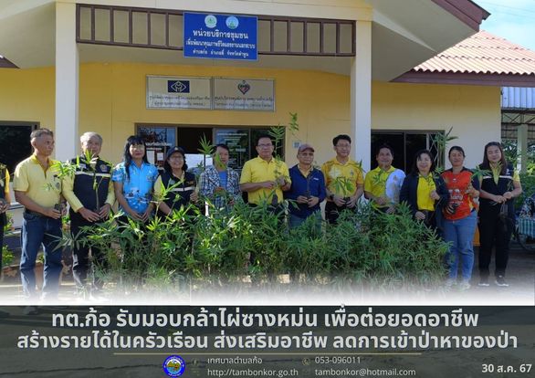 วันที่ 30 สิงหาคม 2567 เวลา 08.30 น. นายอุดม เชียงยศ นายกเทศมนตรีตำบลก้อ พร้อมด้วย คณะผู้บริหาร สมาชิกสภาเทศบาลตำบลก้อ และกลุ่มเกษตรตำบลก้อ รับมอบ กล้าไผ่ซางหม่น จากนายโยธิน ประสงค์ความดี รองผู้ว่าราชการจังหวัดลำพูน และนายประเชิญ สมองดี นายอำเภอลี้ เพื่อต่อยอดอาชีพหลังจากไปศึกษาดูงานที่ศูนย์ศึกษาการพัฒนาห้วยฮ่องไคร้ อันเนื่องมาจากพระราชดำริ อำเภอดอยสะเก็ด จังหวัดเชียงใหม่ สร้างรายได้ในครัวเรือน ส่งเสริมอาชีพใหม่ ลดการเข้าป่าหาของป่า มีทรัพยากรไว้ใช้ริมรั้ว ณ ที่ทำการเทศบาลตำบลก้อ อำเภอลี้ จังหวัดลำพูน