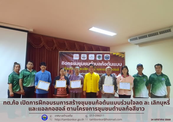 วันที่ 14 มกราคม 2568 นายอุดม เชียงยศ นายกเทศมนตรีตำบล เป็นประธานเปิดการฝึกอบรมการสร้างชุมชนก้อต้นแบบร่วมใจลด ละ เลิกบุหรี่และแอลกอฮอล์ ตามโครงการชุมชนตำบลก้อสีขาว ภายใต้โครงการสานพลังเครือข่ายทางสังคม ลดความามเหลื่อมล้ำ สู่ชุมชนสุขภาวะ เทศบาลตำบลก้อ ณ ห้องประชุมเทศบาลตำบลก้อ