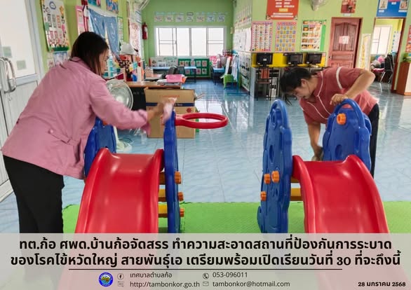 วันที่ 28 มกราคม 2568 นายอุดม เชียงยศ นายกเทศมนตรีตำบลก้อ มอบหมายให้ ครูศูนย์พัฒนาเด็กเล็กบ้านก้อจัดสรร สังกัดเทศบาลตำบลก้อ ทำความสะอาดสถานที่ รวมถึง เครื่องใช้และของใช้ ของเล่นต่างๆ เพื่อป้องกันการระบาดของโรคไข้หวัดใหญ่ สายพันธุ์เอ และเตรียมความพร้อมในการเปิดเรียนปกติในวันพฤหัสบดีที่ 30 มกราคม 2568 ซึ่งไข้หวัดใหญ่สายพันธุ์ A มีความรุนแรงมากที่สุดในกลุ่มไข้หวัดใหญ่ ไข้หวัดใหญ่สายพันธุ์ A อาจทำให้เกิดอาการแทรกซ้อนรุนแรงได้ เช่น ปอดอักเสบ ไปถึงขั้นเสียชีวิต กลุ่มเสี่ยง เช่น เด็กเล็ก ผู้สูงอายุ ผู้ที่มีโรคประจำตัว ผู้ที่มีปัญหาภูมิคุ้มกันควรปรึกษาแพทย์เพื่อดูแลอย่างใกล้ชิด