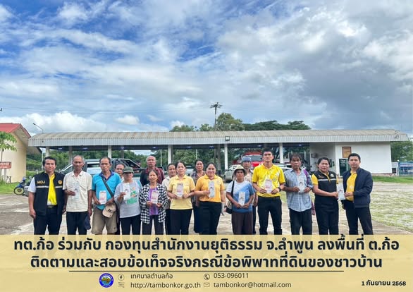 วันที่ 1 กันยายน 2568 นายธนัช มูลใจ นายกเทศมนตรีตำบลก้อ พร้อมด้วยกองยุทธศาสตร์และงบประมาณ เทศบาลตำบลก้อ ร่วมกับ กองทุนสำนักงานยุติธรรมจังหวัดลำพูน ลงพื้นที่ตำบลก้อ อำเภอลี้ จังหวัดลำพูน เพื่อติดตามและสอบข้อเท็จจริงกรณีข้อพิพาทที่ดินของชาวบ้าน จำนวน 12 ราย ซึ่งได้ยื่นคำร้องขอรับความช่วยเหลือจากกองทุนยุติธรรม