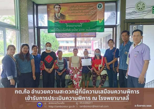 วันที่ 5 กันยายน? 2568 นายธนัช มูลใจ นายกเทศมนตรีตำบลก้อ มอบหมายให้? สมาชิก?สภาเทศบาล?ตำบ?ลก้อ? กองสวัสดิการสังคม เทศบาลตำบลก้อ อำนวยความสะดวกผู้ที่มีความเสมือนความพิการเข้ารับการประเมินความพิการ ณ โรงพยาบาลลี้ เพื่อใช้ประกอบการขึ้นทะเบียนคนพิการและรับสิทธิประโยชน์ตามกฎหมาย ให้ได้รับการรับรองความพิการอย่างถูกต้องและรวดเร็ว ลดภาระการเดินทางและอุปสรรคในการเข้ารับบริการ ส่งเสริมให้เข้าถึงสิทธิและสวัสดิการของรัฐได้อย่างทั่วถึง อำนวยความสะดวกแก่ผู้ที่มีภาวะเสมือนความพิการเข้ารับการประเมินความพิการ เพื่อใช้ประกอบการขึ้นทะเบียนคนพิการและรับสิทธิประโยชน์ตามกฎหมายอย่างทั่วถึงและเท่าเทียม