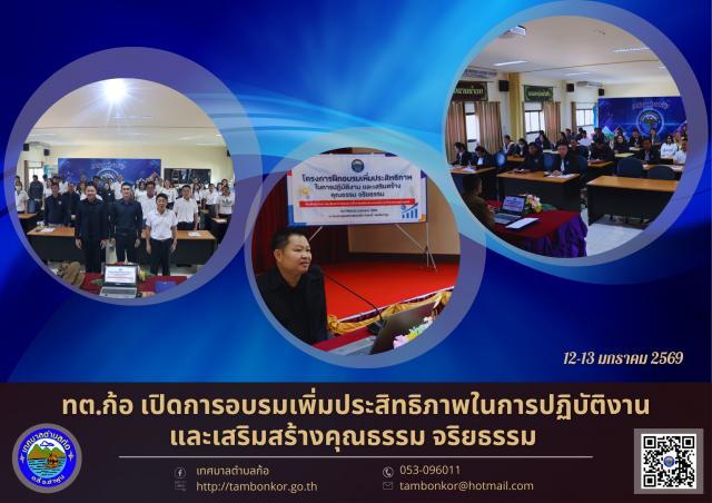 ทต.ก้อ เปิดการอบรมเพิ่มประสิทธิภาพในการปฏิบัติงานและเสริมสร้างคุณธรรม จริยธรรม สำหรับผู้บริหาร สมาชิกสภาเทศบาล พนักงานเทศบาล และพนักงานจ้างเทศบาลตำบลก้อ ประจำปีงบประมาณ พ.ศ. 2569