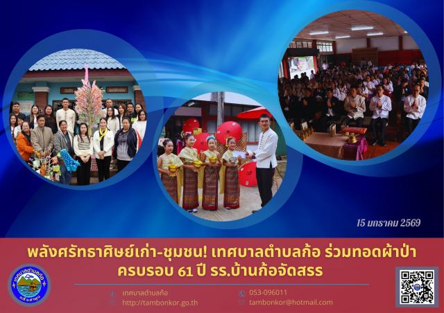 หน้าแรก > อัลบั้มภาพกิจกรรม > พลังศรัทธาศิษย์เก่า-ชุมชน! เทศบาลตำบลก้อ ร่วมทอดผ้าป่าครบรอบ 61 ปี รร.บ้านก้อจัดสรร สมทบทุนจ้างครู-ซ่อมแซมอาคาร ( ประกาศเมื่อวันที่ 15 มกราคม 2569 )