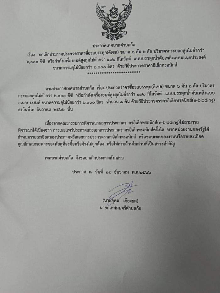 ยกเลิกประกวดราคาซื้อรถบรรทุก(ดีเซล) ขนาด 6 ตัน 6 ล้อ ปริมาตรกระบอกสูบไม่ต่ำกว่า 6,000 ซีซี หรือกำลังเครื่องยนต์สูงสุดไม่ต่ำกว่า 170 กิโลวัตต์ แบบบรรทุกน้ำดับเพลิงแบบอเนกประสงค์ ขนาดความจุน้ำไม่น้อยกว่า 6,000 ลิตร ด้วยวิธีประกวดราคาอิเล็กทรอนิกส์ (e-bidding)