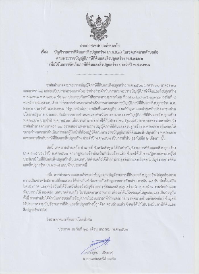 ประกาศเทศบาลตำบลก้อ เรื่องรายการที่ดินและสิ่งปลูกสร้าง(ภ.ด.ส.3)ในเขตเทศบาลตำบลก้อ ตามพระราชบัญญัติภาษีที่ดินและสิ่งปลูกสร้าง พ.ศ.2562 เพื่อใช้ในการจัดเก็บภาษีที่ดินและสิ่งปลูกสร้าง ประจำปี พ.ศ.2567