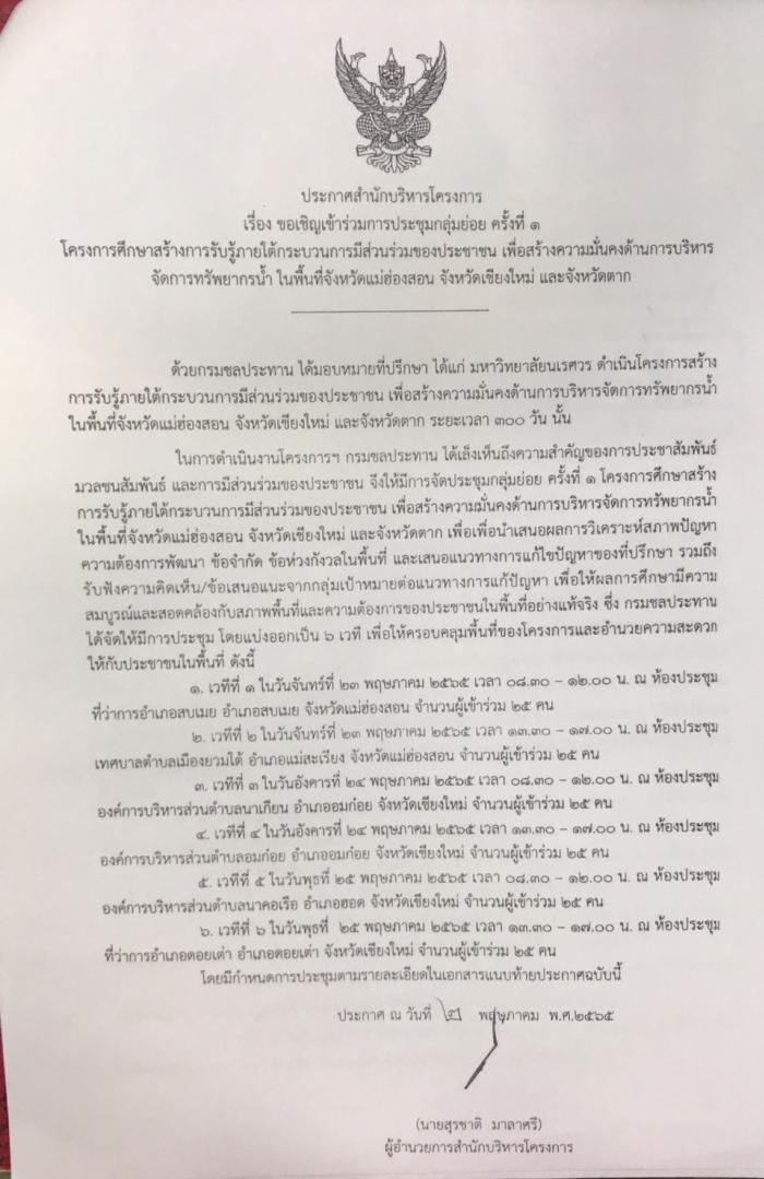 ประกาศสำนักบริหารโครงการ เรื่อง ขอเชิญเข้าร่วมการประชุมกลุ่มย่อย ครั้งที่ 1 โครงการศึกษาสร้างการรับรู้ภายใต้กระบวนการมีส่วนร่วมของประชาชน เพื่อสร้างความมั่นคงด้านการบริหารจัดการทรัพยากรน้ำ ในพื้นที่จังหวัดแม่ฮ่องสอน จังหวัดเชียงใหม่ และจังหวัดตาก
