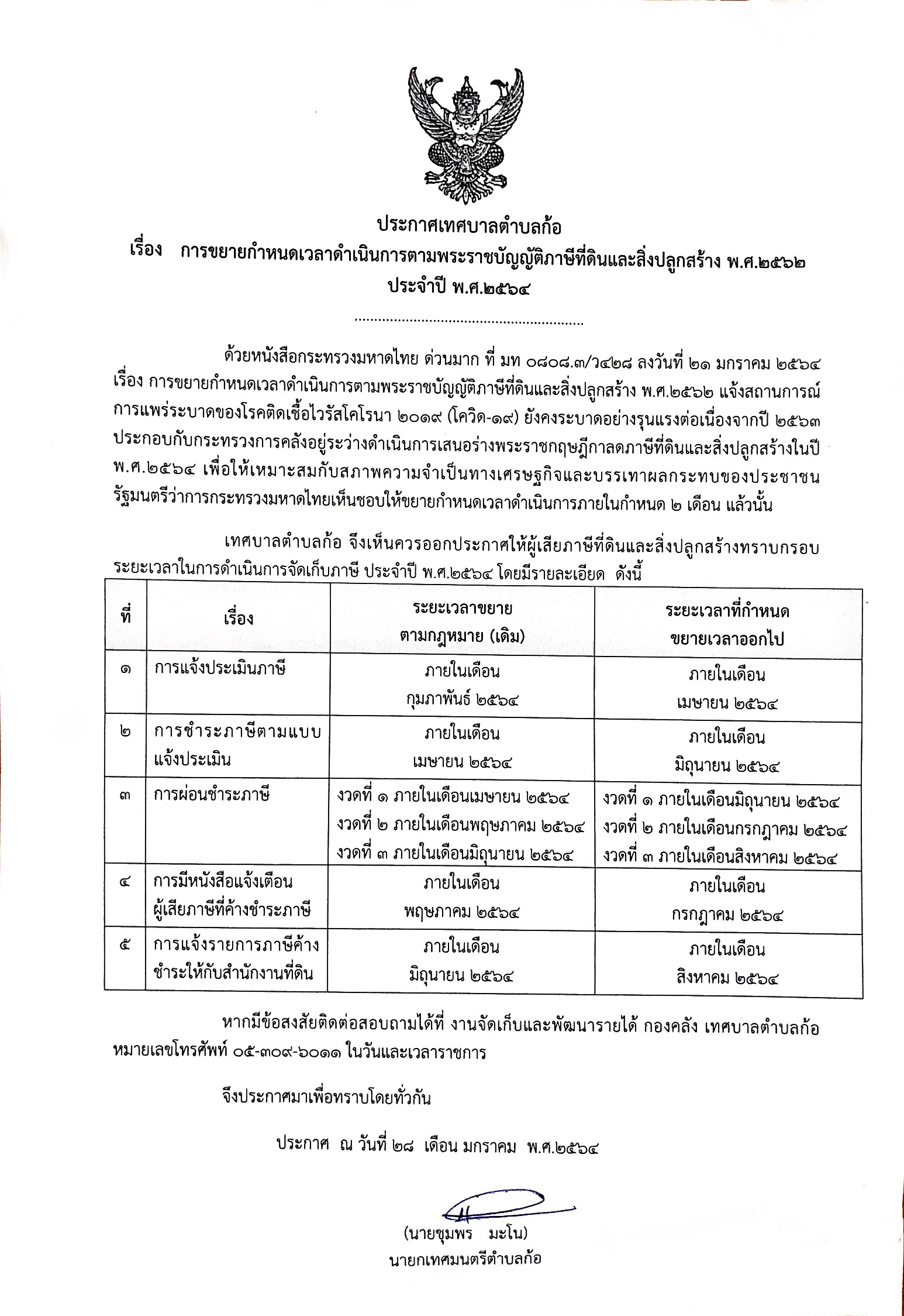 ประกาศเทศบาลตาบลก้อ เรื่อง การขยายกำหนดเวลาดำเนินการตามพระราชบัญญัติภาษีที่ดินและสิ่งปลูกสร้าง พ.ศ.2562 ประจำปี พ.ศ.2564